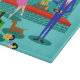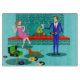 This Retro Couple with Dog Cutting Board looks like a scene out of a romantic comedy. The 1960s's style, minimalist art design features an attractive couple enjoying a romantic evening at home. The sophisticated room prominently features an aqua and teal brick fireplace with a bright red ledge. A beautiful, redhead woman wearing a bright, pink dress is perched on the ledge. She is enjoying a martini with a floating olive, a roaring fire, good music, and the company a tall, dark and handsome man. The man is wearing a blue suit and red tie. His martini glass is raised to toast his charming companion. In his other hand, he is holding a vinyl record album. At his feet, we see a most adorable dachshund wearing a red collar. The playful wiener dog is walking in the direction of a green record player with orange, spindle legs. On the floor, there is a colourful group of fun, eclectic, vinyl records. Cheers! Here's to the perfect evening at home.