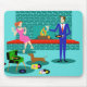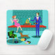 This Retro Couple with Dog Mousepad looks like a scene out of a romantic comedy. The 1960s's style, minimalist art design features an attractive couple enjoying a romantic evening at home. The sophisticated room prominently features an aqua and teal brick fireplace with a bright red ledge. A beautiful, redhead woman wearing a bright, pink dress is perched on the ledge. She is enjoying a martini with a floating olive, a roaring fire, good music, and the company a tall, dark and handsome man. The man is wearing a blue suit and red tie. His martini glass is raised to toast his charming companion. In his other hand, he is holding a vinyl record album. At his feet, we see a most adorable dachshund wearing a red collar. The playful wiener dog is walking in the direction of a green record player with orange, spindle legs. On the floor, there is a colourful group of fun, eclectic, vinyl records. Cheers! Here's to the perfect evening at home.