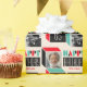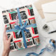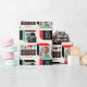 Transform your birthday gift with this stylish personalised wrapping paper! A seamless, geometric pattern with retro cubes framing two of your favourite photos. This editable template can be personalised further with the recipient's name and celebrated age. Colours: red, green, black and off-white.