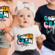 This particular design features a cute retro saying printed on the front that reads "Cousin Crew." with customisable name. The text is likely to be in a bold and fun font that adds to the retro playful and energetic nature of the message. The phrase "Cousin Crew" suggests that the baby is part of a lively and active group of cousins playing baseball, and celebrates the camaraderie and friendship that comes with having a big extended family. The design is likely to appeal to parents or caregivers who have a close-knit family and who wish to acknowledge the special bond between cousins. The message is inclusive and welcoming, highlighting the sense of belonging and community that can come with being part of a big family.