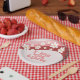Young Wild and Three! Retro inspired third birthday party plates with 70's style daisies and boho fonts and colours.