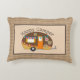 Whimsical brown and tan retro camper design has white and orange daisies and a cute orange door. Patterned background