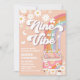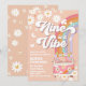 Celebrate in groovy style with this retro birthday party invitation featuring a cheerful peach background, white daisies, butterflies, stars, and a vibrant rainbow. A pink flower-power van with peace signs adds a fun 1960s and 1970s vibe, perfect for kids who love colourful, nostalgic themes. This playful design is ideal for a 9th birthday celebration, but can be customised for any age or event. Make your party unforgettable with a unique, eye-catching invitation that sets the tone for peace, love, and fun.