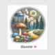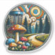 A unique colourful disc golf course in a field of retro mushrooms, pine trees and clouds in vintage colours like orange, blue and red.