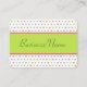 Bright dots of colour decorate this retro style business card. Customise the card to suit your needs, add or delete information etc...Use these business cards for a business, attorney, consultant, education, educator, golf, golf pro, golf course, landscaping, lawn care, contractor, programmer, tutor, musician, artist, painter, stylist, hair stylist, daycare, preschool, florist, bakery, designer, barber, accountant, restaurant, boutique, shop, etc...