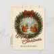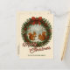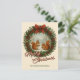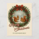 This retro-style holiday postcard features a wreath decorated with a gold-yellow bow, green holly leaves, red berries, and two adorable squirrels. Its classy yet rustic design beautifully captures the essence of the December holiday season and appeals to those who appreciate artistic illustrations. The card also offers customisation options, allowing you to personalise it with your company name, family name, or individual names. Additionally, you can include a handwritten custom greeting on the back, making it a thoughtful choice for spreading holiday cheer.