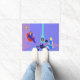 This Retro Evening at Home Door Mat looks like a scene out of a 1960's romantic comedy. The minimalist design features an attractive cartoon couple in the living room of a mid century modern house. The room prominently features a purple and blue stone wall and a matching purple and blue striped rug. Against the wall, there is a turquoise, cone shaped fireplace with a roaring fire. In the corner, the suave man of the house is lounging in a red egg chair. He is wearing a blue suit with a blue tie. In one hand, he is holding a martini glass. No wonder he's so relaxed! Hanging from the ceiling, there is a yellow, Sputnik light fixture. A woman with an hourglass figure is sitting on the rug. She is wearing a vibrant, blue dress and not a hair is out of place in her flippy blonde "do". Beside her, on the floor, there is a blue and black portable record player. Several vinyl record albums are scattered near the beautiful deejay. Go ahead and sing along. You know you want to!