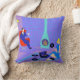 This Retro Evening at Home Throw Pillow looks like a scene out of a 1960's romantic comedy. The minimalist design features an attractive cartoon couple in the living room of a mid century modern house. The room prominently features a purple and blue stone wall and a matching purple and blue striped rug. Against the wall, there is a turquoise, cone shaped fireplace with a roaring fire. In the corner, the suave man of the house is lounging in a red egg chair. He is wearing a blue suit with a blue tie. In one hand, he is holding a martini glass. No wonder he's so relaxed! Hanging from the ceiling, there is a yellow, Sputnik light fixture. A woman with an hourglass figure is sitting on the rug. She is wearing a vibrant, blue dress and not a hair is out of place in her flippy blonde "do". Beside her, on the floor, there is a blue and black portable record player. Several vinyl record albums are scattered near the beautiful deejay. Go ahead and sing along. You know you want to!
