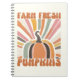 This vibrant and retro-inspired fall design highlights the phrase "Farm Fresh Pumpkins" in bold, playful typography that immediately grabs attention. At the centre of the design is a large, stylised pumpkin, depicted in warm autumnal shades of orange, brown, and cream. The pumpkin is framed by a dynamic burst of colourful rays extending outward, featuring a palette of muted oranges, pinks, yellows, and greens that add a nostalgic, vintage feel to the design. The combination of the sunburst pattern and the chunky, curvaceous font gives the artwork a fun and energetic vibe, perfect for capturing the festive spirit of fall.