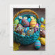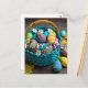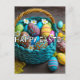 This holiday postcard features several colourful Easter eggs resting in a hand-made basket.