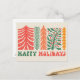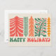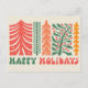 This vibrant holiday card embraces a retro design featuring a series of stylised trees in shades of red, orange, and green, each with its own unique, decorative pattern. The trees are adorned with stars, berries, and festive branches, evoking a sense of holiday cheer and whimsy. The words "Happy Holidays" are displayed in bold, playful font at the bottom, adding a nostalgic touch to this delightful design. Perfect for sending joyful greetings during the festive season with a vintage flair.