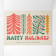 This vibrant holiday card embraces a retro design featuring a series of stylised trees in shades of red, orange, and green, each with its own unique, decorative pattern. The trees are adorned with stars, berries, and festive branches, evoking a sense of holiday cheer and whimsy. The words "Happy Holidays" are displayed in bold, playful font at the bottom, adding a nostalgic touch to this delightful design. Perfect for sending joyful greetings during the festive season with a vintage flair.