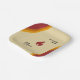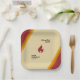Red, orange and tan brown wedding paper plate with corner with stripe. Personalise it with your event details.
