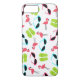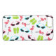An iPhone 6 case featuring a pattern consisting of pink flamingos, green flip flops, and retro blue cat eye sunglasses.