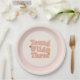 Pink "young wild & three" paper plates for a retro floral theme third birthday celebration.