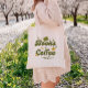 An elegant green and gold "books + coffee" tote bag, designed with retro lettering and florals, perfect for book lovers and coffee lovers.