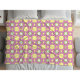 Towels with a retro floral pattern hang on a rod. The design features yellow circles on pink, accented by starburst shapes, evoking a playful vintage vibe.