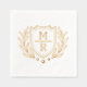 Retro floral design of foil stamped napkins with shield and monograms. Wedding napkin with two monograms, a shield and a wreath.