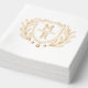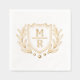Retro floral design of foil stamped napkins with shield and monograms. Wedding napkin with two monograms, a shield and a wreath.