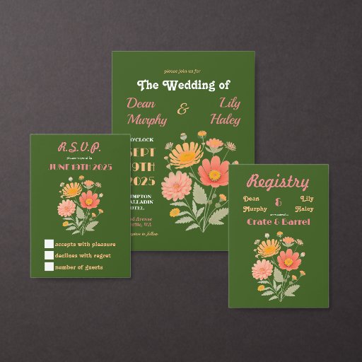 This bold and eye-catching wedding invitation was created with a retro aesthetic in mind. It features a burst of colours and playful typography that instantly captures attention. Vintage-inspired floral elements bring a sense of warmth and elegance to the overall look, making it a perfect choice for couples who appreciate the nostalgic charm of the past.