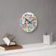 This clock has a mid-century modern design a retro flower garden in a retro colour palette or red, orange, yellow, green, and blue.