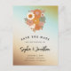 Retro Flower Power QR Code Terracotta Aqua Gradient Wedding Save the Date... Our terracotta and aqua gradient wedding Save the Date features a "flower power" style bouquet reminiscent of the 1960s hippie era drawing attention to your wedding information text below. The back of the card contains your return address, wedding website URL, and an example QR code graphic template you can replace easily with your own wedding website QR code - right on the personalisation template. All example text on both sides of the card can be easily revised with your own details on the personalisation template.