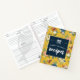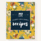 Pretty floral recipe book printed with an eye catching floral pattern in a strong mustard yellow with retro flowers in blush, coral, and blue with lots of blue and green leaves, and pale berries. Add your name to the dark blue label between cute kitchen utensils in white and recipes written in a very bold white calligraphy script.