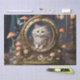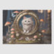 Cute fluffy white cat in antique clock, surrounded by mushrooms and flowers. Retro. Decoupage tissue paper. Perfect for arts, crafts, gift giving, furniture decoupage, journalling and scrapbooks etc.