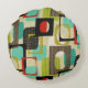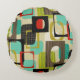 16” round throw pillow with a 50s-style image, on both sides, of black, brown, red and mustard frames, black and yellow patterned rectangles, and turquoise and white squares on tan. See matching square throw pillow, accent pillow and cube pouf pillow. See the entire Nifty 50s Pillow collection in the DECOR | Pillows section.