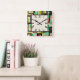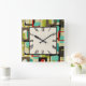 10.75” x 10.75” square acrylic wall clock with a fun retro image of black, brown, red and mustard frames, black and yellow patterned rectangles, and turquoise and white squares on tan. The cream square has a black border and Roman numeral clock face. See the entire Nifty 50s Clock collection in the DECOR | Clocks section.