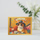 A cute whimsical retro postcard featuring a painting of a cat eating cakes.
