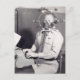 This postcard features a retro photograph of a military officer wearing a bizarre gas mask.