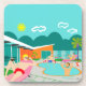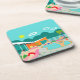 This Retro Gay Pool Party Hard Plastic Coaster features four hunky beefcakes having a gay old time as they beat the Palm Springs heat by lounging around the turquoise blue water of their atomic boomerang shaped swimming pool. The mid century modern architecture on the fabulous, orange stone house is clearly prime real estate, given the view of the mountains in the background. A yellow starburst sun shines brightly in the turquoise sky so you are able to see every charming detail--from the kitschy, pink flamingos to the 1950’s striped, breezy blocks fence. And of course what Palm Springs House would be complete without a palm tree?