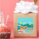This Retro Gay Pool Party Sticker design features four hunky beefcakes having a gay old time as they beat the Palm Springs heat by lounging around the turquoise blue water of their atomic boomerang shaped swimming pool. The mid century modern architecture on the fabulous, orange stone house is clearly prime real estate, given the view of the mountains in the background. A yellow starburst sun shines brightly in the turquoise sky so you are able to see every charming detail--from the kitschy, pink flamingos to the 1950’s striped, breezy blocks fence. And of course what Palm Springs House would be complete without a palm tree?