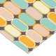 Retro geometric pattern with overlapping vertical ovals in shades of teal, peach, orange, and cream on a dark brown background. Vibrant and symmetrical.