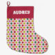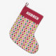 Add some joy to your Christmas gifts with this patterned stocking featuring a simple geometric pattern in a retro 1970s colour palette of red, lime green, orange, pink and green against a white background. Your name appears at the top in retro style white lettering against a red background.