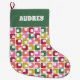 Add some joy to your Christmas gifts with this patterned stocking featuring a simple geometric pattern in a retro 1970s colour palette of red, lime green, orange, pink and green against a white background. Your name appears at the top in retro style white lettering against a green background.