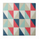 Ceramic tile featuring trendy geometric pattern with blue, red and beige triangles.