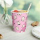 Cute halloween party paper cups featuring a groovy pink background, a group of retro ghosts, and creepy spiders.
