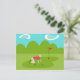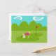 This Retro Golfer Postcard is more fun than a day on the greens. The 1960's style, minimalist art design is anything but par for the course. It features a lone golfer on a lush, green fairway. The mid century modern golfer is making a real fashion statement in his stylish, plaid, golf pants and fuchsia shirt. The blonde, fit, weekend warrior is on his hands and knees attempting to line up a shot. Or maybe he's attempting to give the ball a nudge in the direction of the hole. Does it really matter? At his side, we see a single, golf club. In front of him, is the elusive hole, with a red flag, which is taunting him. The background features a green line of cartoon trees, an aqua sky and two, white, kidney bean shaped clouds. This design is sure to be a hole in one with your favourite golf pro.