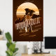 Striking retro-style poster design of a border collie with a background of mountains and large sun graphic all in monochrome shades of gold through brown. A large decorative font names the dog breed. Search ID754 to see other colour options and additional dog breeds in this style.