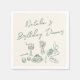 As you see this unique and elegant birthday dinner napkin has a well designed template. With green hand drawn brunch tableware of , floral bouquet, candles, cake, wine bottle and glass, grapes, knife and fork and whimsical hand written name. All on cream background . Which you can customise easily by clocking on the personalise button.