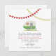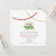 A wedding invitation featuring an illustration of a green vintage trailer parked in grass. Trailer has a window box filled with daisies and black eyed susans. Yellow and red bunting at top. Personalise the text with details of your occasion. Look for matching items at Jill's Paperie.