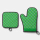A kitchen set with a retro green plaid pattern with thin horizontal stripes of blue and white and a green borders on the oven mitt.