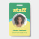 One-sided vertical ID badge for your staff in a retro design in green, yellow, and blue. Personalise with your employee's photo, name, and title beneath staff in a bold eye-catching yellow font. The badge is simple and easy to read, printed without logo, in bold and happy colours.