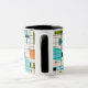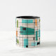 This Retro Grid and Starbursts Ringer Mug is where vintage style meets modern day. It features a cream coloured background with kitschy, off kilter squares and rectangles in teal, turquoise, This light blue, orange, and avocado green. The whimsical blocks of colour are overlayed are worked into some of the grid intersections. There are also black rectangles with black vertical and horizontal lines forming a grid pattern. Black starburst designs and squares placed sporadically throughout this mid century modern tapestry of colour. Grab your go-go boots and bell-bottoms and enjoy this throwback to the 1960s.