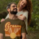 This fun and groovy wedding t-shirt is perfect for the groom. It features a retro sun design with 70's typography. The colour scheme includes terracotta, orange, mustard-yellow, and beige. It's playful, unique, boho, and hippie.