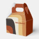 This groovy retro wedding favour box features wavy lines in tan, brown, and orange, reminiscent of the 70s and hippie lifestyle. Bold vintage reception party favour box with funky white script of the couple's name next to the abstract curvy lines. Groove along with this fun earth tone design.