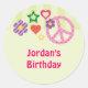Retro theme sticker great for a young girl’s birthday party. It features typical icons from the 70’s such as the peace sign, flower and star. Colourful and cute design great for a fun event. Use it for party favours or to seal envelopes.