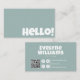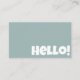 Make your business simply fun and cleanly elegant . A minimalist neutral green retro groovy hello unique business card template . As you see it features warm fun plane sage green background. And white elegant bold groovy font of hello in the front . And in the back you have the full name and title .And social media icons and custom QR code with other info. You can simply customise it by clicking in the blue Personalise button and then change the info. What you waiting for!! Go a head and grab it . we guarantee you the amazing quality and fast shipping.
